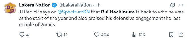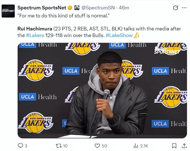 八村壘賽后接受采訪,他盛贊了這個團隊能看出他很不愿意離開LAL,他說道:我 要表揚我的教練,教練在會議上跟他們談過了,讓勒布朗、盧卡要多給隊友球,他們也確實這樣做了,他們總是接受教練的建議,所以我們能贏球,每個人都可以觸球,每個人都能積極參與進攻,這才是籃球該有的樣子。