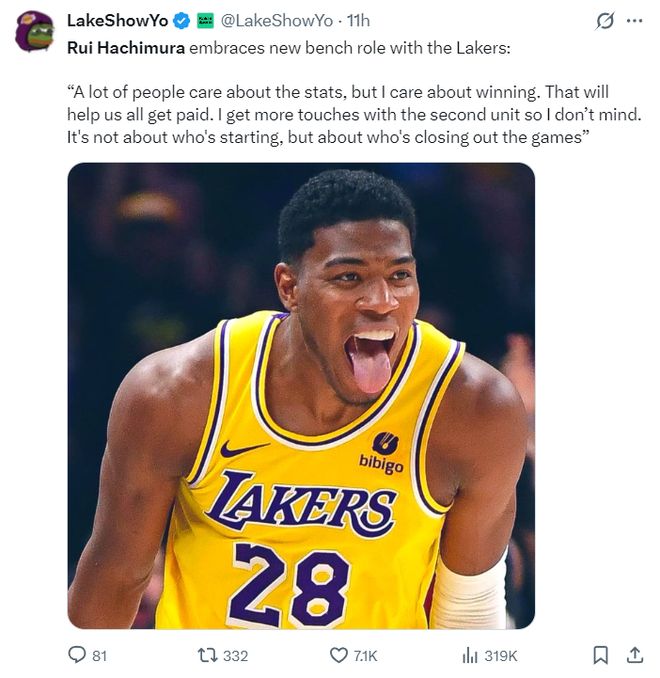 這場比賽的超級奇兵是八村壘,在賽前《洛杉磯時報》報道,八村壘已經(jīng)接受了替補角色,他更在乎球隊的勝利而非個人數(shù)據(jù),他甚至覺得自己在第二陣容可以獲得更多的出手機會。他還認為在決勝時刻登場比先發(fā)登場更有價值。