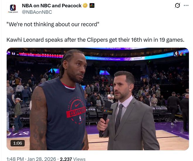 快船19戰(zhàn)16勝創(chuàng)聯(lián)盟第一
