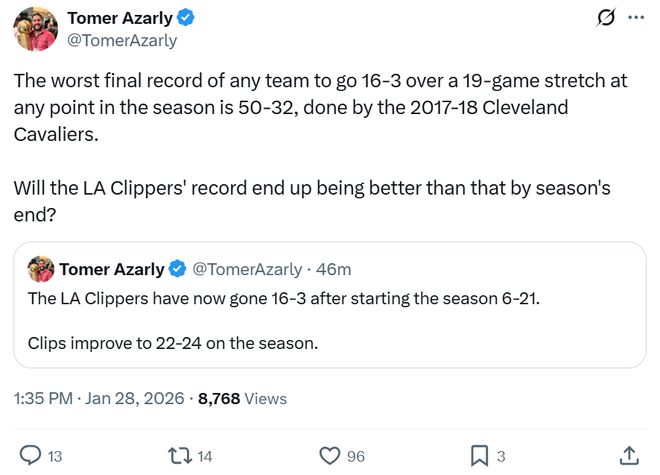 根據(jù)快船隊(duì)記Tomer Azarly統(tǒng)計(jì),NBA歷史上所有在單賽季打出過(guò)至少19戰(zhàn)16勝的球隊(duì),最終的最差戰(zhàn)績(jī)是50勝32負(fù),由17-18賽季的騎士隊(duì)創(chuàng)造。
