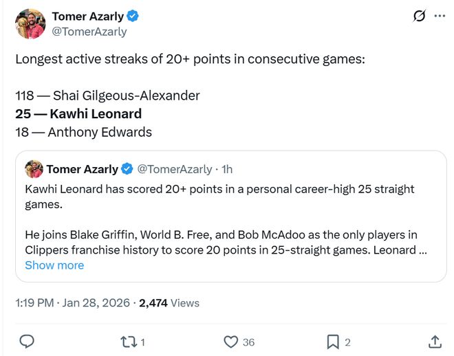憑借這樣的表現(xiàn),小卡連續(xù)25場(chǎng)比賽砍下20+得分刷新個(gè)人生涯紀(jì)錄的同時(shí),也是聯(lián)盟現(xiàn)存第二長(zhǎng)紀(jì)錄,并且成為快船隊(duì)史第4位做到這一點(diǎn)的球員。