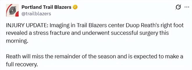 - 開拓者傷情更新!里斯接受右腳手術賽季報銷 兩大后衛(wèi)接近復出
