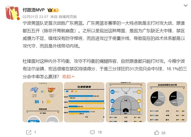 賽后付政浩認為廣東輸球的關鍵是缺乏大中鋒,禁區(qū)的威懾力不足,鋒線上沒有防守悍將,進攻過于依賴外線,導致現(xiàn)在的戰(zhàn)術體系是以攻代守,而且是外線帶動內線。