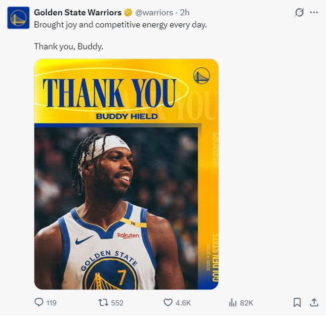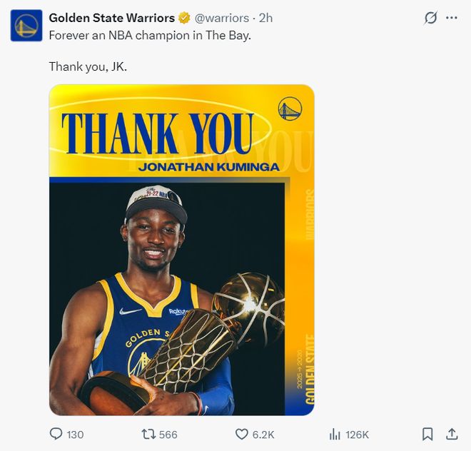 勇士官方也感謝了希爾德、庫(kù)明加,這兩被送到老鷹。