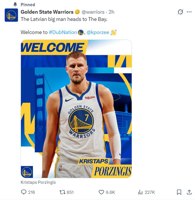 勇士官方宣布交易達(dá)成歡迎波爾津吉斯到來(lái)。