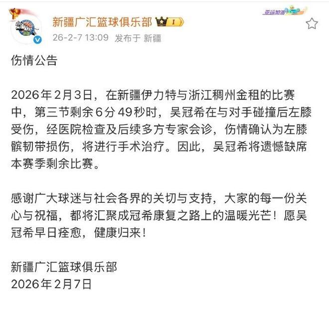 新疆男籃官方傷病公告寫道:“2026年2月3日,在新疆男籃與浙江男籃的比賽中,第三節(jié)剩余6分49秒時,吳冠希在與對手碰撞后左膝受傷。經(jīng)醫(yī)院檢查及后續(xù)多方專家會診,傷情確認(rèn)為左膝髕韌帶損傷,將進(jìn)行手術(shù)治療,因此吳冠希將遺憾缺席本賽季剩余比賽?!?/p>