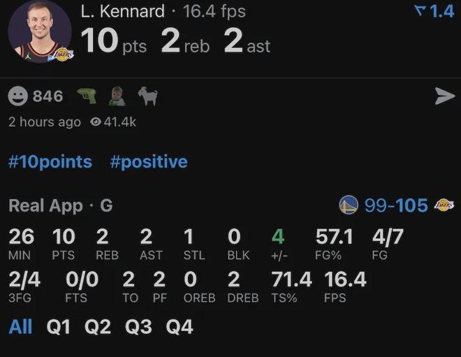 用文森特+一個(gè)次輪簽換來(lái)的肯納德,此役完成了湖人生涯首秀,替補(bǔ)出戰(zhàn)約26分鐘,投籃7中4,其中三分4中2貢獻(xiàn)10分2板2助1斷,正負(fù)值+4。