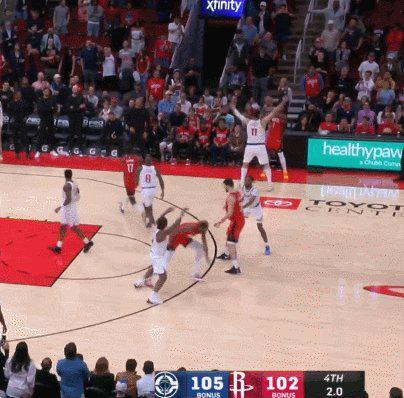 比賽還剩7.2秒時(shí),申京2罰1中幫助火箭扳平比分??焱和:箜樌麑⑶虬l(fā)到了萊昂納德手中,在他接球的瞬間,快艇有三名球員留在球場(chǎng)左側(cè),讓空間威脅足夠大的布魯克·洛佩斯一個(gè)人站在右底角,這擺明了是讓萊昂納德突右路完成一記自己最擅長(zhǎng)的中距離投籃。
