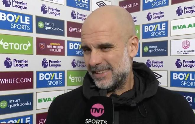 英超第30輪,曼城客場1-1戰(zhàn)平西漢姆聯(lián),賽后,曼城主帥瓜迪奧拉接受了TNT體育的采訪。