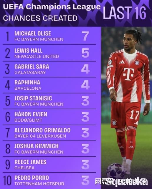 最新的代表作發(fā)生在拜仁對陣亞特蘭大的歐冠1/8決賽首回合,奧利塞在進攻三區(qū)內(nèi)的傳球次數(shù)最多(32次)、對手禁區(qū)內(nèi)觸球次數(shù)最多(9次)、創(chuàng)造機會最多(7次)、傳中次數(shù)最多(6次)、射門次數(shù)并列最多(5次)、射正最多(4次)。