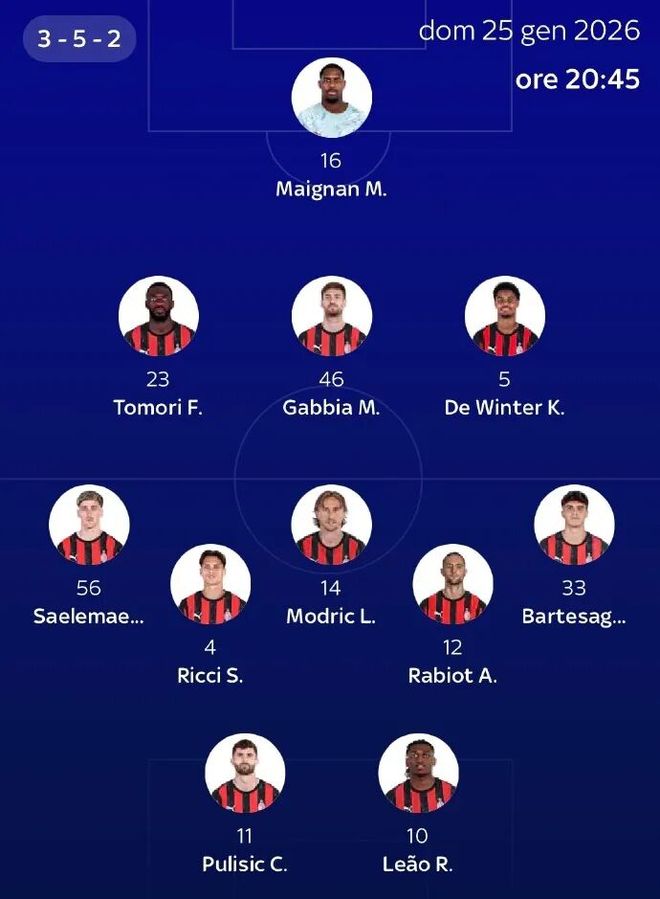 意大利天空體育發(fā)布了本場比賽米蘭的預(yù)測首發(fā):