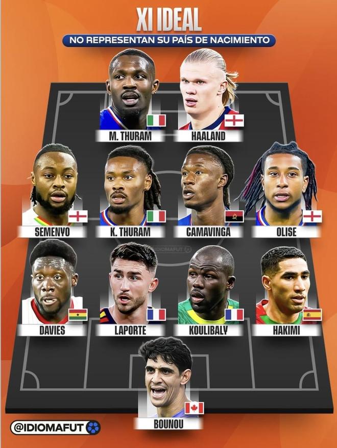 最近Idiomafut發(fā)布了“不代表出生國的最佳陣容”。哈蘭德、圖拉姆、奧利塞、卡馬文加、戴維斯、拉波爾特、庫利巴利、哈基米和布努入選。名單里最大的反差,是他們的出生國和代表國家隊對不上,英格蘭、意大利、法國、加拿大這些出生地和最終選擇的國家隊形成了明顯錯位。把這11個人按位置拼成一套首發(fā),這套陣容的整體實力到底能到什么檔次?
