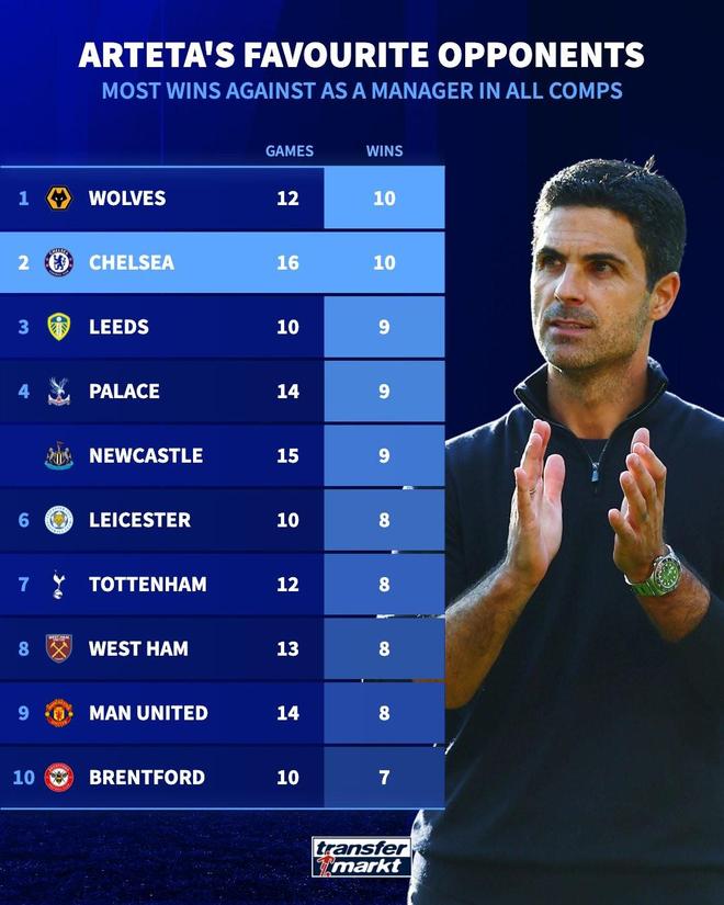 根據德國足球轉會市場的最新統(tǒng)計,阿森納主帥阿爾特塔在執(zhí)教生涯中,面對切爾西取得了16場10勝的戰(zhàn)績,這是他贏球次數最多的對手,與狼隊并列勝場榜首位。