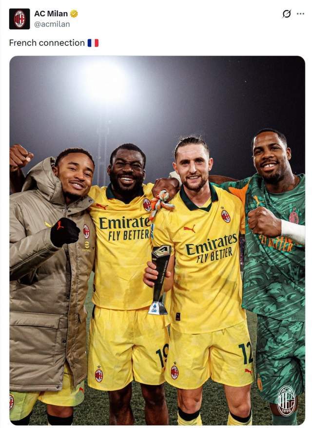 而拉比奧特的爆發(fā),也是米蘭“法國幫”集體發(fā)威的體現(xiàn)。本場除了他,恩昆庫創(chuàng)造點球并罰進,邁尼昂穩(wěn)健零封,福法納踢滿全場。米蘭官方社媒賽后特意曬出四人合照,配文“法國幫”。這條中軸線(門將-中場-前鋒)的穩(wěn)定輸出和默契,構(gòu)成了米蘭戰(zhàn)術(shù)體系的國際縱隊核心,他們的出色狀態(tài)是球隊?wèi)?zhàn)績的硬保障。