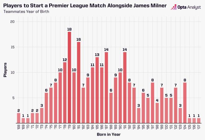 米爾納在英超聯(lián)賽中擁有281名不同的隊(duì)友,曾與出生于1968年至2007年每年的球員并肩作戰(zhàn)。