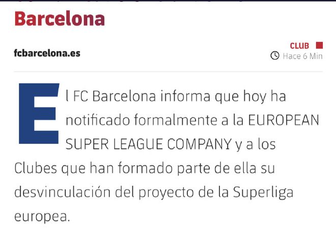 - 巴薩發(fā)布官方公告 宣布退出歐超聯(lián)賽