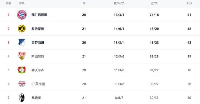 說(shuō)到這里,就必須聊聊積分榜的變化了,這也是大家最關(guān)心的話題。目前拜仁依舊占據(jù)榜首位置,16勝3平1負(fù),拿到51分,依舊是爭(zhēng)冠的最大熱門,畢竟他們的穩(wěn)定性擺在那里。