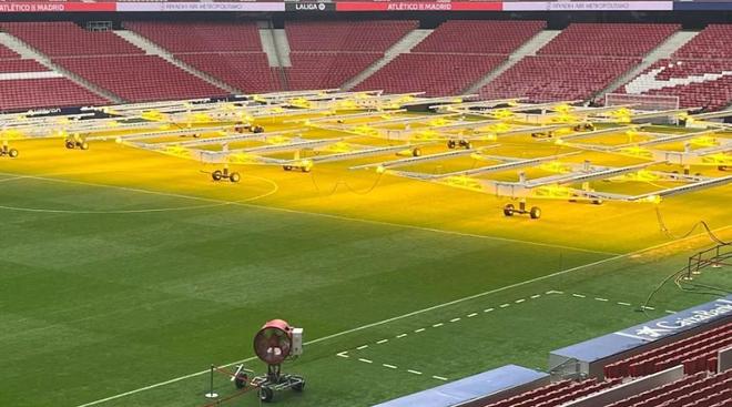 目前距離馬競對陣巴薩的首回合比賽僅剩48小時左右,球場內(nèi)近一半?yún)^(qū)域覆蓋著生長燈——這類模擬陽光的燈具常被用于高水平草坪的維護。2024年起,大都會球場開始使用Hatko Hybridgrass,這是一種新一代混合草皮,由西班牙公司Royalverd負(fù)責(zé)安裝并提供技術(shù)支持。