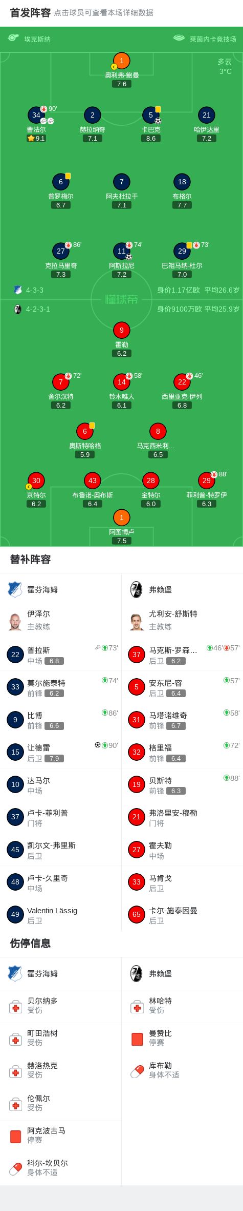 - 霍芬海姆3-0大勝弗賴堡,讓德雷、卡巴克破門